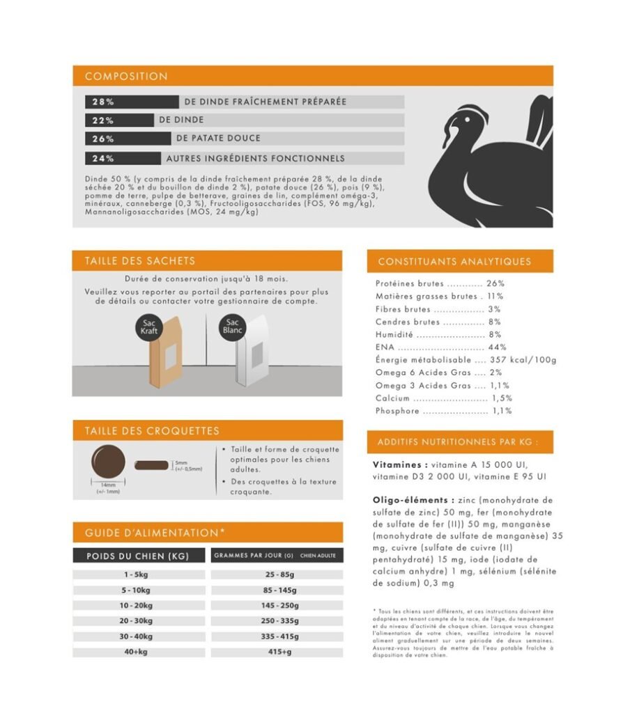Recette élaborée avec 55% de poulet dont 31% de frais et 26% de patate douce pour tous les chiens adultes de plus de 15kg
