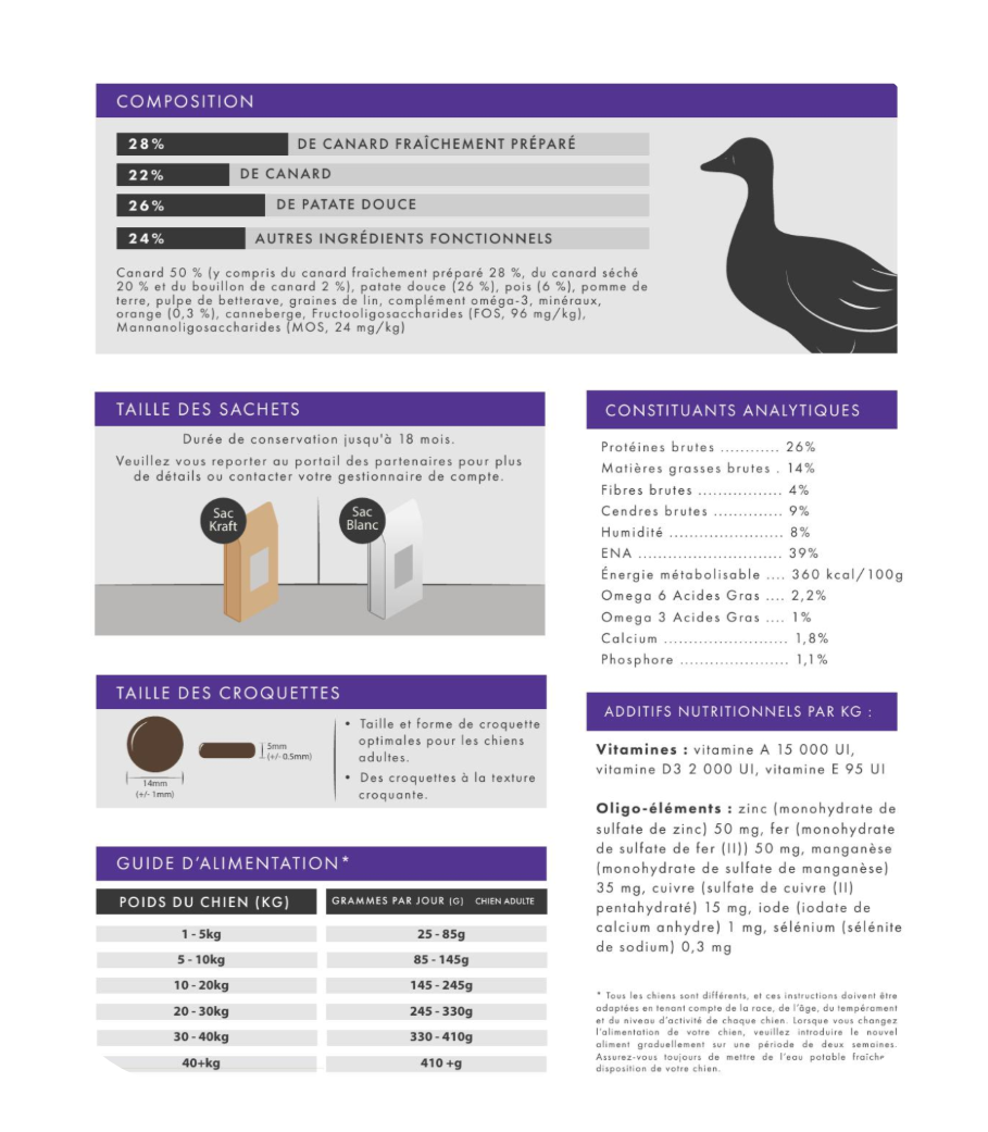 Vous êtes à la recherche d’une croquette très gourmande et appétissante pour tous les chiens adultes notamment les plus difficiles, faîtes le choix de cette recette riche en canard élaborée avec de la viande fraîche et séchée.