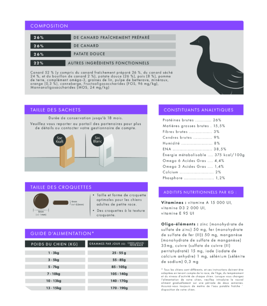 Vous êtes à la recherche d’une croquette très appétente pour votre chien difficile, faîtes le choix de cette recette riche en canard élaborée avec de la viande fraîche et séchée.