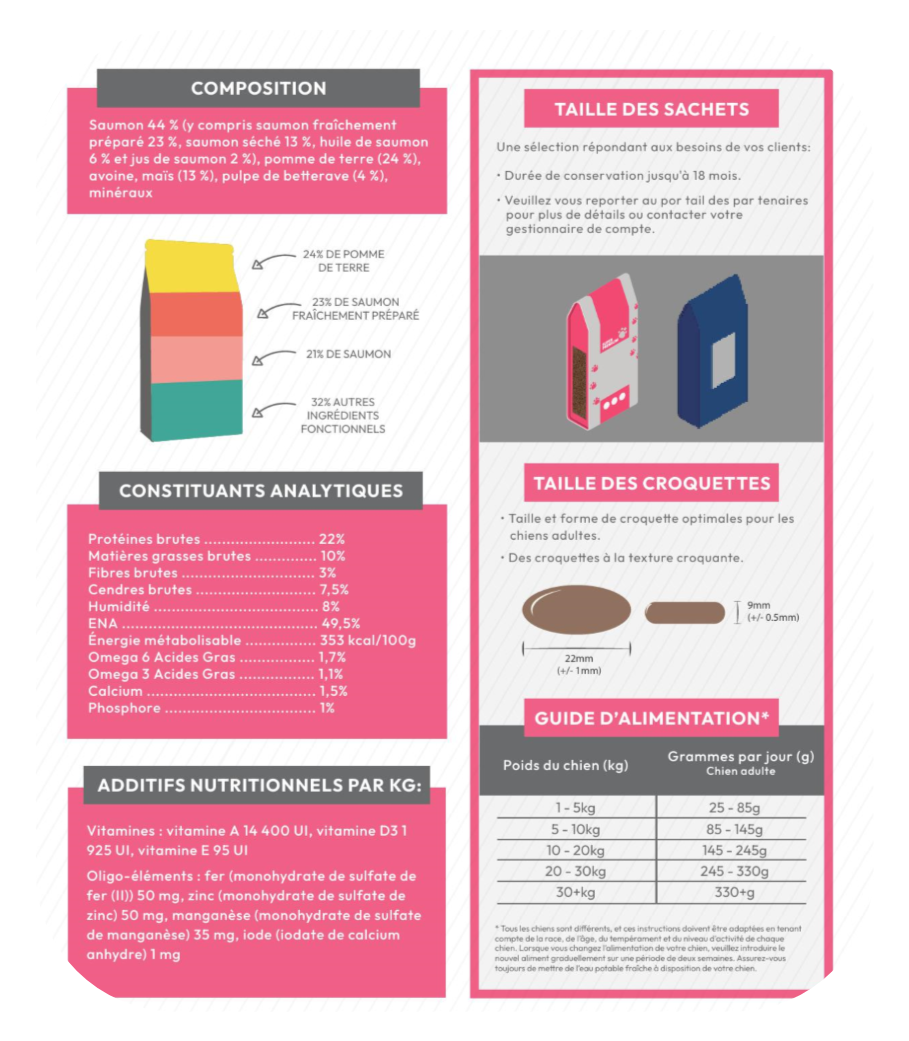 Du saumon à l’appétence exceptionnelle dans cette recette pour tous les chiens adultes de plus de 10kg.
